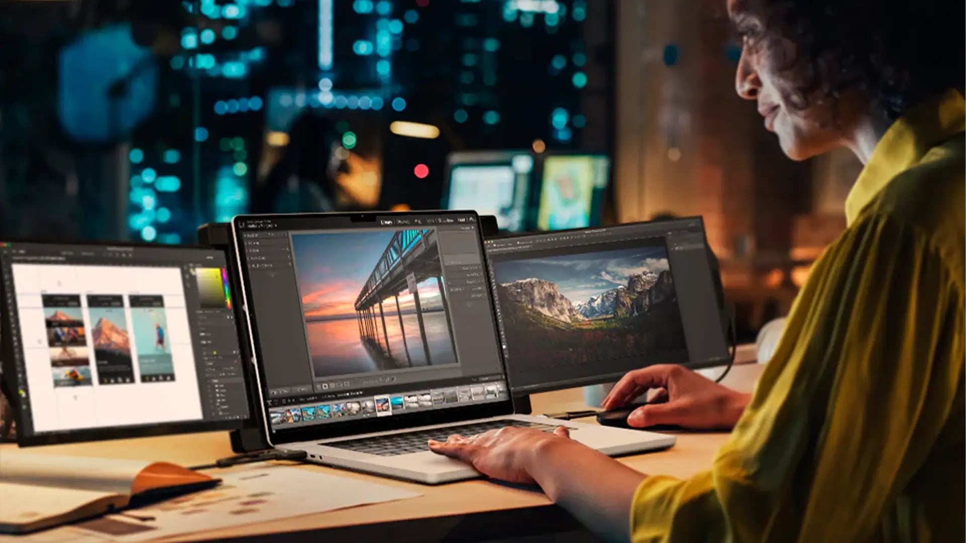 Breid je laptop uit met twee extra schermen voor grenzeloze productiviteit, waar je ook bent.